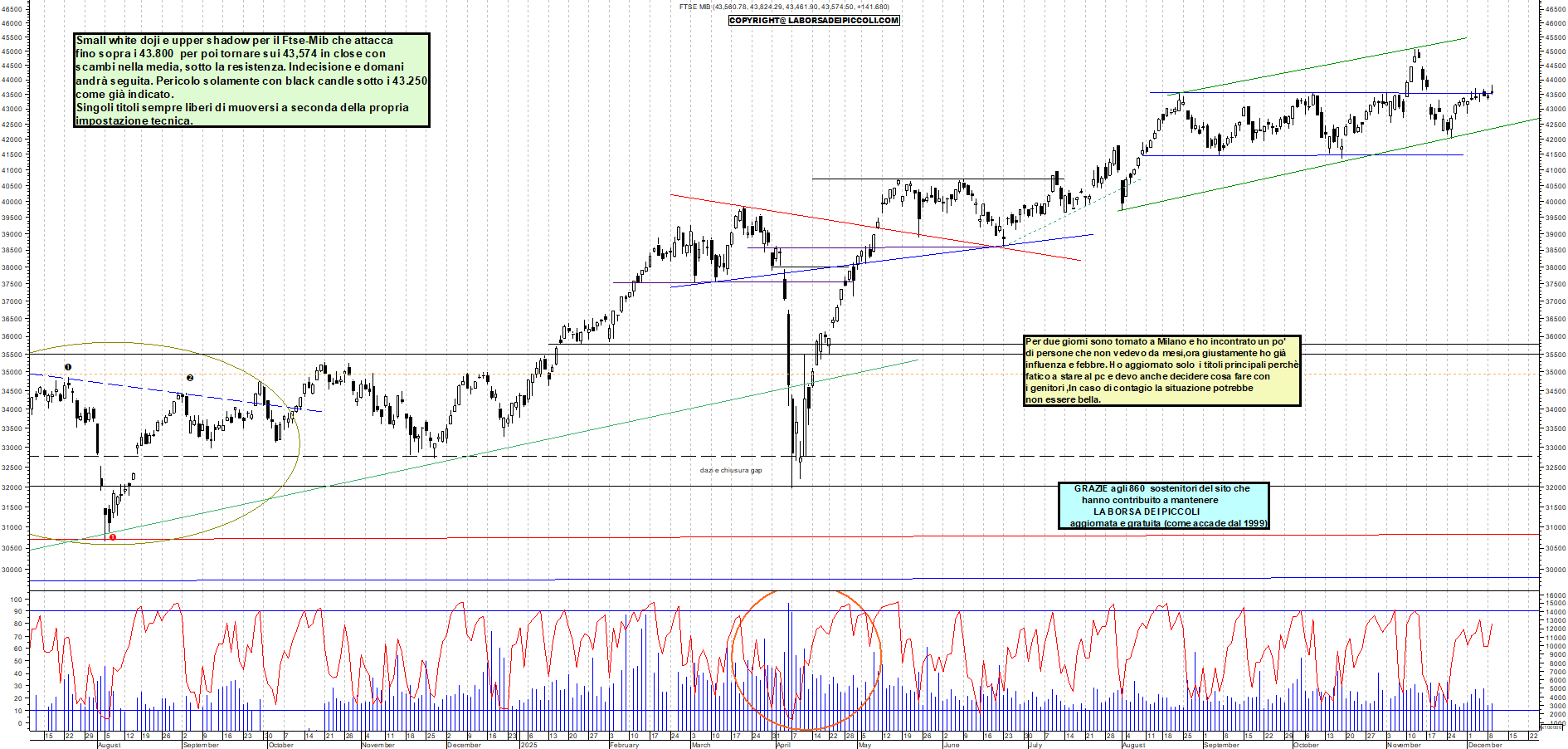 FTSEMIB: Small white doji e upper shadow per il Ftse-Mib che attacca fino sopra i 43.800 per poi tornare sui 43,574 in close con scambi nella media, sotto la resistenza. Indecisione e domani andrà seguita. Pericolo solamente con black candle sotto i 43.250 come già indicato. Singoli titoli sempre liberi di muoversi a seconda della propria impostazione tecnica.