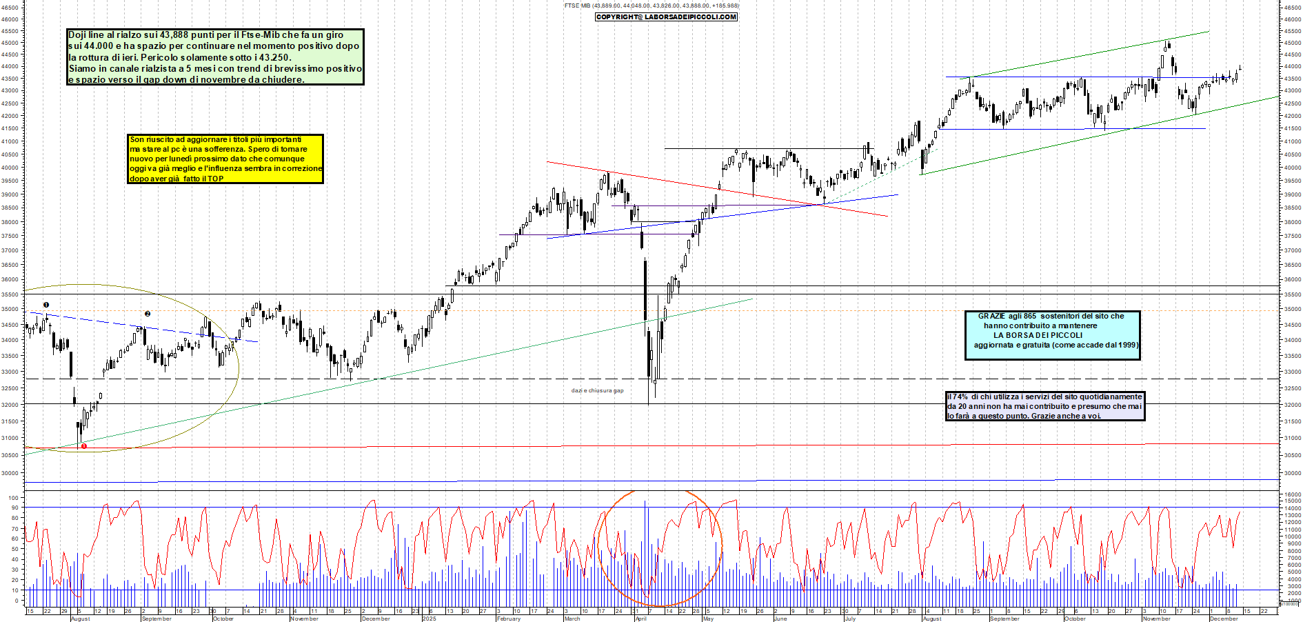 FTSEMIB: Doji line al rialzo sui 43,888 punti per il Ftse-Mib che fa un giro sui 44.000 e ha spazio per continuare nel momento positivo dopo la rottura di ieri. Pericolo solamente sotto i 43.250. Siamo in canale rialzista a 5 mesi con trend di brevissimo positivo e spazio verso il gap down di novembre da chiudere.
