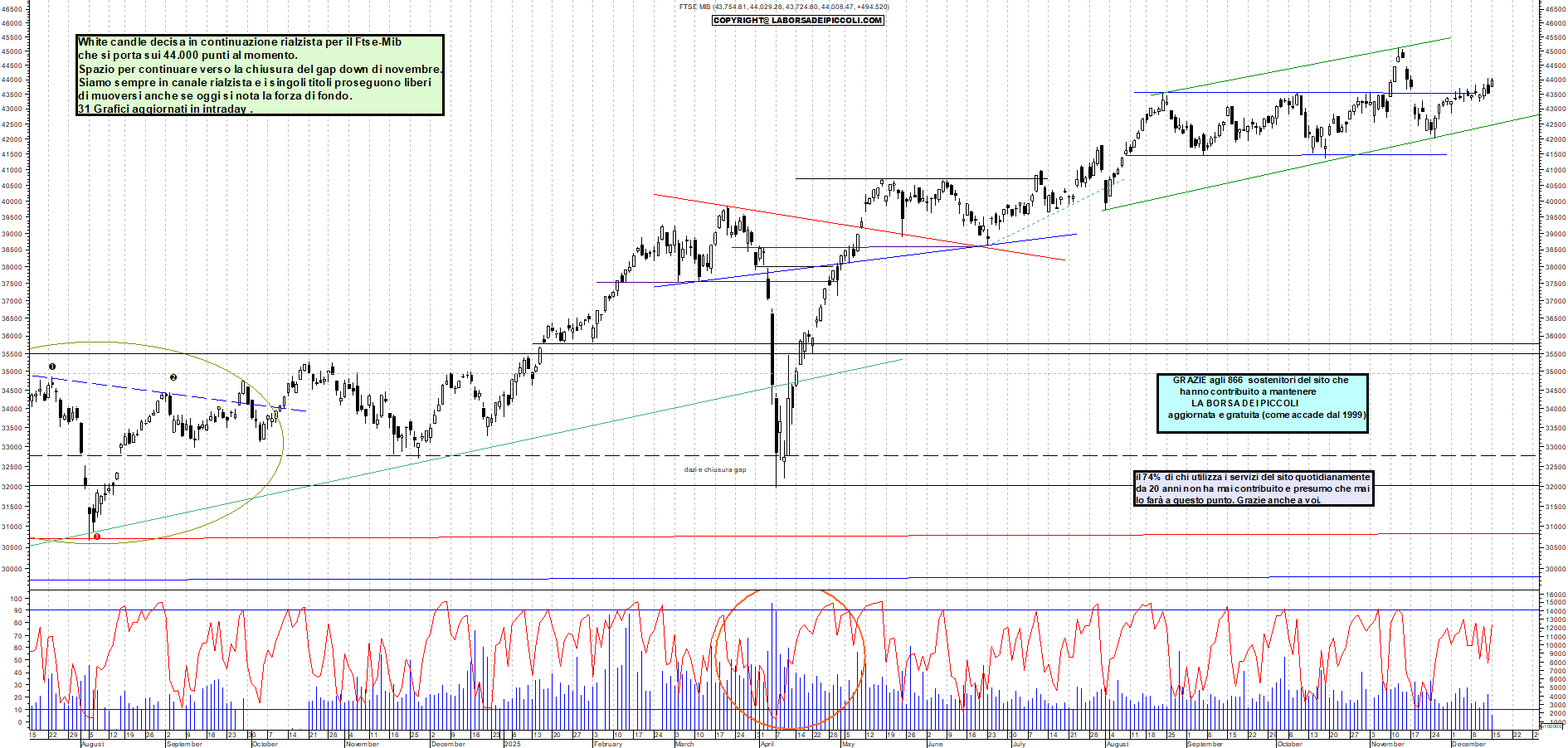 FTSEMIB: White candle decisa in continuazione rialzista per il Ftse-Mib che si porta sui 44.000 punti al momento. Spazio per continuare verso la chiusura del gap down di novembre. Siamo sempre in canale rialzista e i singoli titoli proseguono liberi di muoversi anche se oggi si nota la forza di fondo. 31 Grafici aggiornati in intraday .