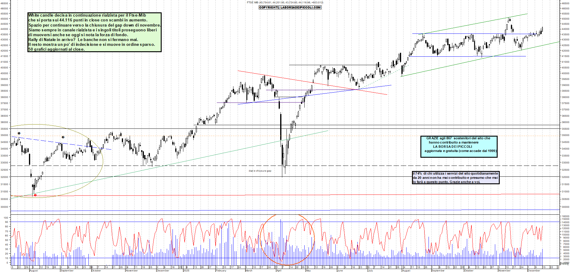 FTSEMIB: White candle decisa in continuazione rialzista per il Ftse-Mib che si porta sui 44.116 punti in close con scambi in aumento. Spazio per continuare verso la chiusura del gap down di novembre. Siamo sempre in canale rialzista e i singoli titoli proseguono liberi di muoversi anche se oggi si nota la forza di fondo. Rally di Natale in arrivo? Le banche non si fermano mai. Il resto mostra un po' di indecisione e si muove in ordine sparso. 50 grafici aggiornati al close.