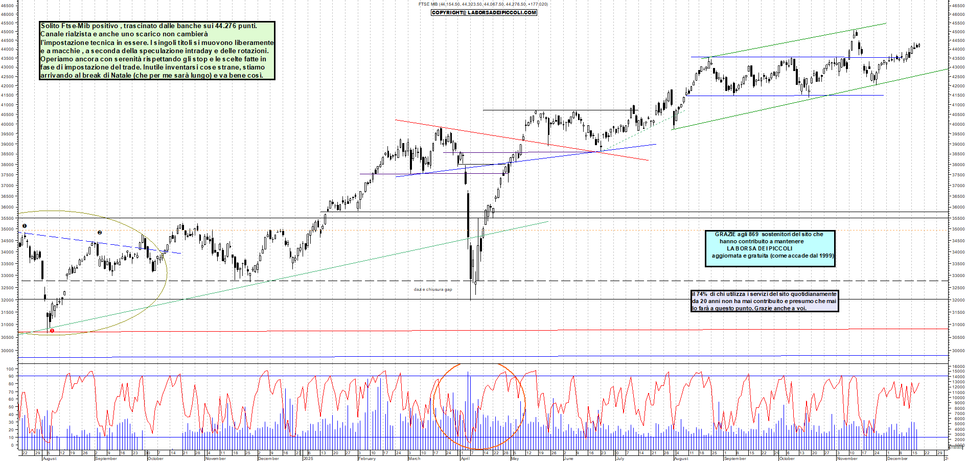 FTSEMIB: Solito Ftse-Mib positivo , trascinato dalle banche sui 44.276 punti. Canale rialzista e anche uno scarico non cambierà l'impostazione tecnica in essere. I singoli titoli si muovono liberamente e a macchie , a seconda della speculazione intraday e delle rotazioni. Operiamo ancora con serenità rispettando gli stop e le scelte fatte in fase di impostazione del trade. Inutile inventarsi cose strane, stiamo arrivando al break di Natale (che per me sarà lungo) e va bene così.