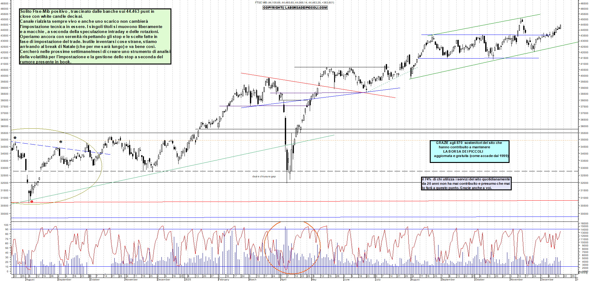 FTSEMIB: Solito Ftse-Mib positivo , trascinato dalle banche sui 44.463 punt in close con white candle decisai. Canale rialzista sempre vivo e anche uno scarico non cambierà l'impostazione tecnica in essere. I singoli titoli si muovono liberamente e a macchie , a seconda della speculazione intraday e delle rotazioni. Operiamo ancora con serenità rispettando gli stop e le scelte fatte in fase di impostazione del trade. Inutile inventarsi cose strane, stiamo arrivando al break di Natale (che per me sarà lungo) e va bene così. Cercherò nelle prossime settimane/mesi di creare uno strumento di analisi della volatilità per l'impostazione e la gestione dello stop a seconda del rumore presente in book.