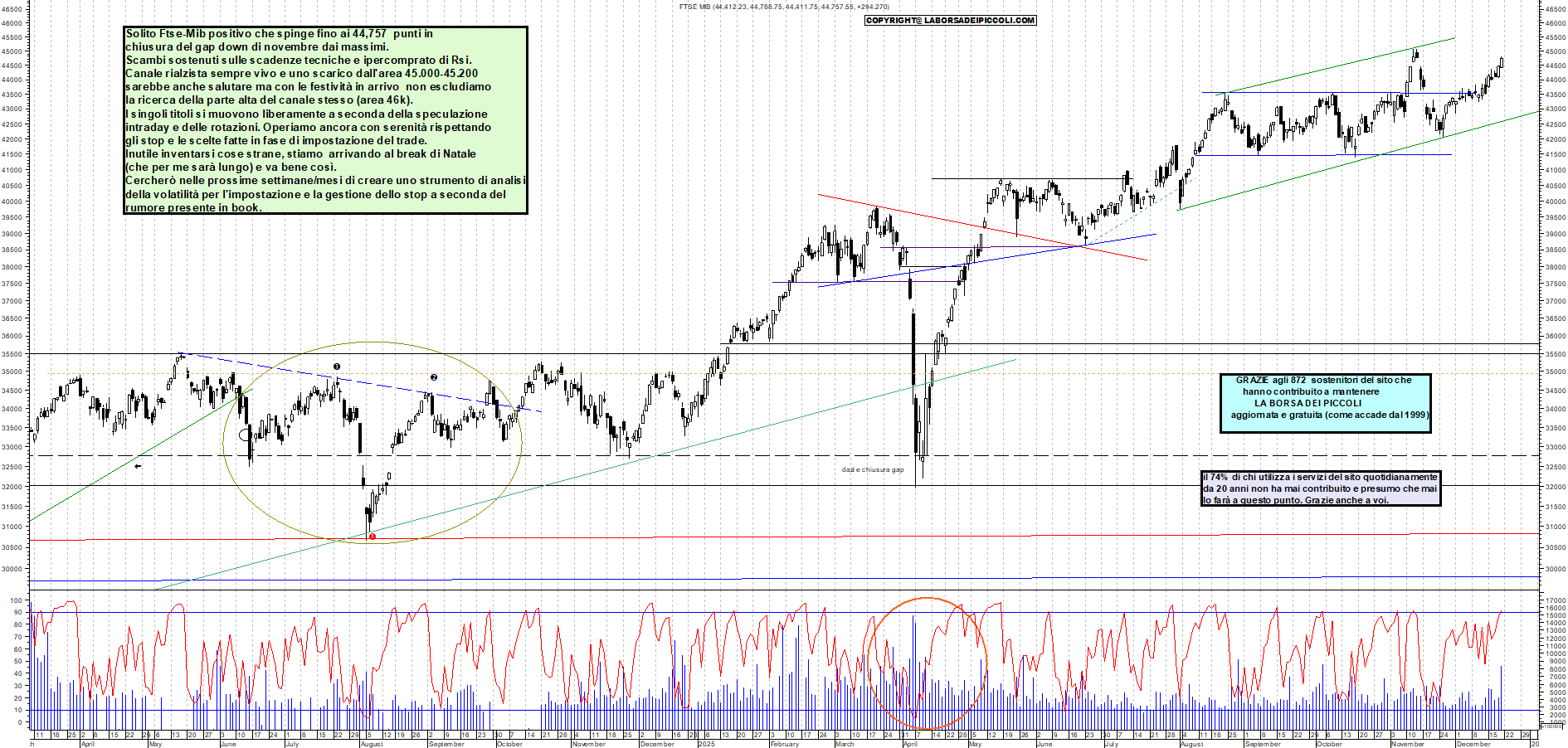 FTSEMIB: Solito Ftse-Mib positivo che spinge fino ai 44,757 punti in chiusura del gap down di novembre dai massimi. Scambi sostenuti sulle scadenze tecniche e ipercomprato di Rsi. Canale rialzista sempre vivo e uno scarico dall'area 45.000-45.200 sarebbe anche salutare ma con le festività in arrivo non escludiamo la ricerca della parte alta del canale stesso (area 46k). I singoli titoli si muovono liberamente a seconda della speculazione intraday e delle rotazioni. Operiamo ancora con serenità rispettando gli stop e le scelte fatte in fase di impostazione del trade. Inutile inventarsi cose strane, stiamo arrivando al break di Natale (che per me sarà lungo) e va bene così. Cercherò nelle prossime settimane/mesi di creare uno strumento di analisi della volatilità per l'impostazione e la gestione dello stop a seconda del rumore presente in book.