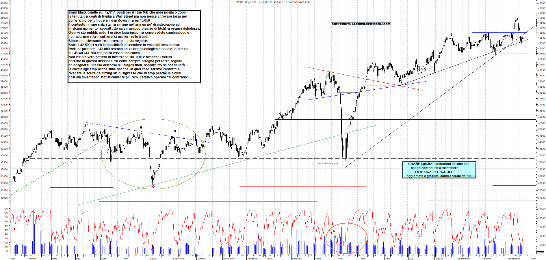 FTSEMIB: Small black candle sui 42,917 punti per il Ftse-Mib che apre positivo dopo la tenuta dei conti di Nvidia a Wall Street ma non riesce a trovare forza nel pomeriggio per chiudere il gap down in area 43.650. Il contesto rimane rialzista ma rimane nell'aria un po' di indecisione ed in alcuni momento (soprattutto su un gruppo preciso di titoli) si respira debolezza. Oggi vi sto pubblicando il grafico logarimico ma come vedete cambia poco e non abbiamo riferimenti grafici migliori sulle trend. Situazione sicuramente interessante e da seguire. Sotto i 42.500 ci sarà la possibilità di scendere in volatilità senza chiari livelli da puntare . I 42.000 restano un valore psicologico e poi c'e' lo statico sui 41.400-41.500 che potrà essere indicativo. Non c'e' un vero pattern di inversione sul TOP e neanche i volumi portano in questa direzione ma come sempre bisogna per forza seguire ed adeguarsi. Stesso discorso sui singoli titoli, soprattutto se continuerà la caccia agli stop anche sulle banche. In quel caso saremo costretti a rivedere le scelte del timing sia di ingresso che di stop perchè in alcuni casi sta diventando statisticamente più remunerativo operare "al contrario".