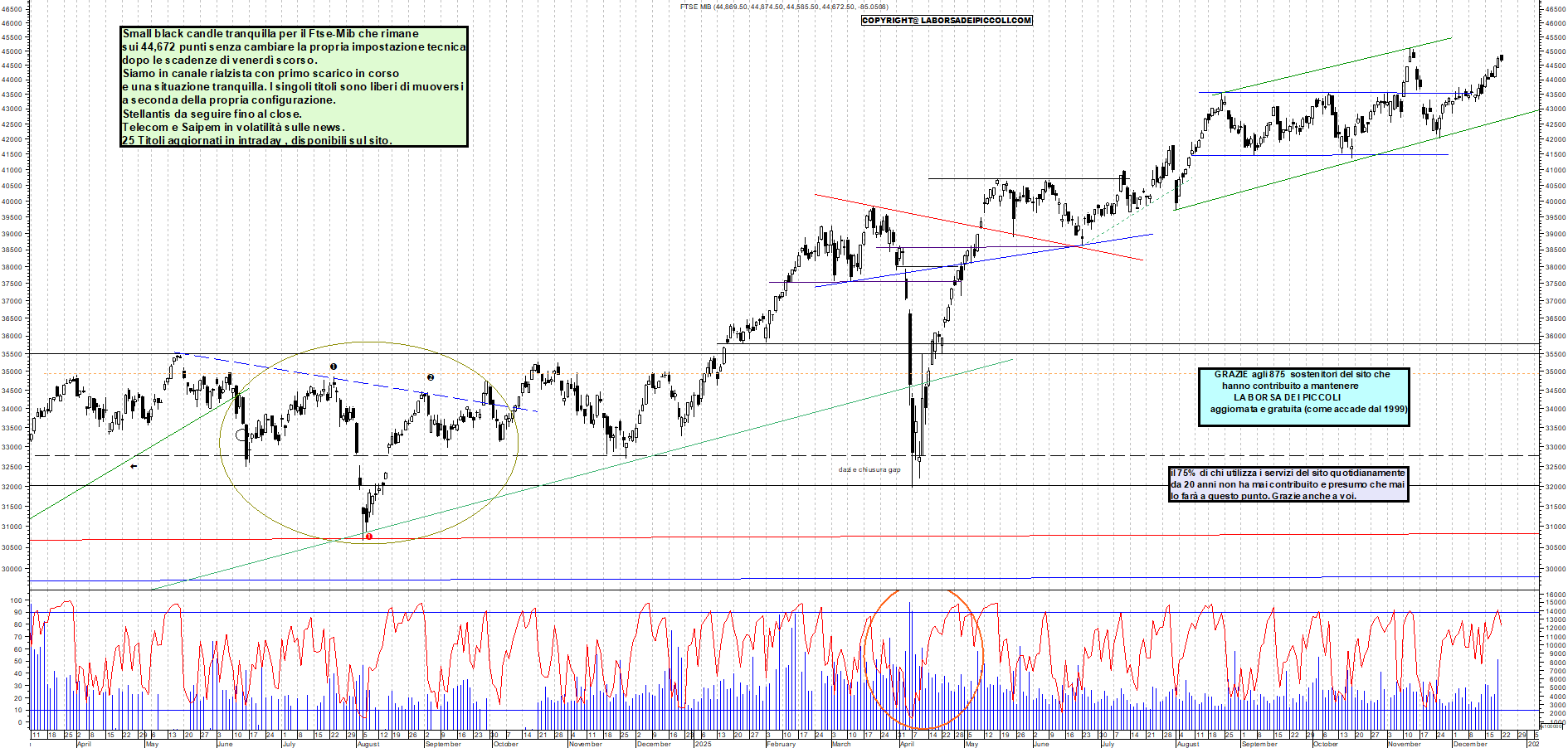 FTSEMIB: Small black candle tranquilla per il Ftse-Mib che rimane sui 44,672 punti senza cambiare la propria impostazione tecnica dopo le scadenze di venerdì scorso. Siamo in canale rialzista con primo scarico in corso e una situazione tranquilla. I singoli titoli sono liberi di muoversi a seconda della propria configurazione. Stellantis da seguire fino al close. Telecom e Saipem in volatilità sulle news. 25 Titoli aggiornati in intraday , disponibili sul sito.