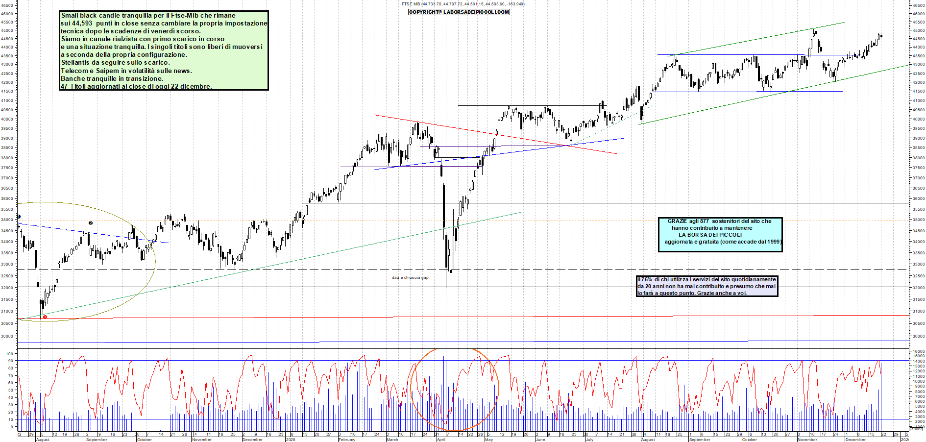 FTSEMIB: Small black candle tranquilla per il Ftse-Mib che rimane sui 44,593 punti in close senza cambiare la propria impostazione tecnica dopo le scadenze di venerdì scorso. Siamo in canale rialzista con primo scarico in corso e una situazione tranquilla. I singoli titoli sono liberi di muoversi a seconda della propria configurazione. Stellantis da seguire sullo scarico. Telecom e Saipem in volatilità sulle news. Banche tranquille in transizione. 47 Titoli aggiornati al close di oggi 22 dicembre.