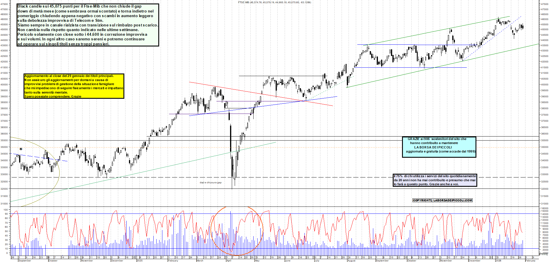 FTSEMIB: Black candle sui 45,075 punti per il Ftse-Mib che non chiude il gap down di metà mese (come sembrava ormai scontato) e torna indietro nel pomeriggio chiudendo appena negativo con scambi in aumento leggero sulla debolezza improvvisa di Telecom e Stm. Siamo sempre in canale rialzista con transizione sul rimbalzo post scarico. Non cambia nulla rispetto quanto indicato nelle ultime settimane. Pericolo solamente con close sotto i 44.600 in correzione improvvisa e sui volumi. In ogni altro caso saremo sereni e potremo continuare ad operare sui singoli titoli senza troppi pensieri.