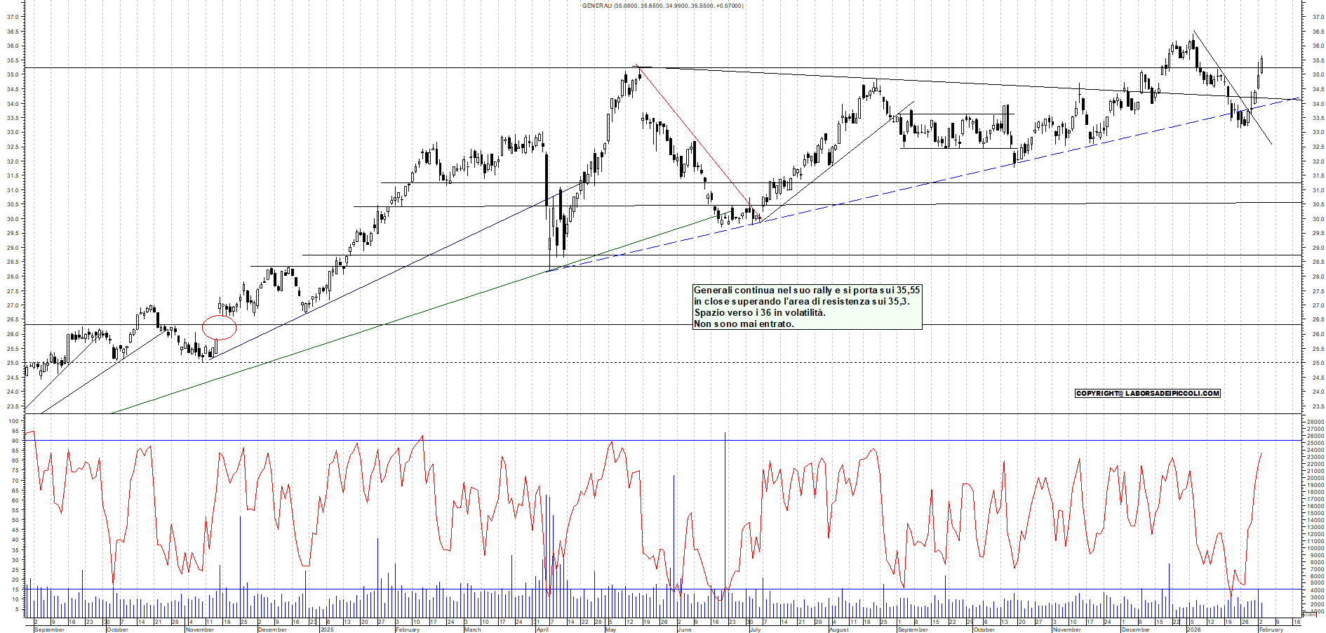 GENERALI: Generali continua nel suo rally e si porta sui 35,55 in close superando l'area di resistenza sui 35,3. Spazio verso i 36 in volatilità. Non sono mai entrato.