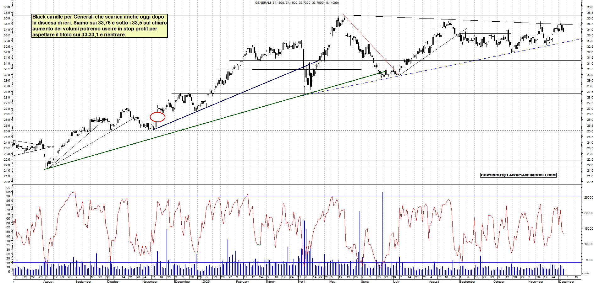 GENERALI: Black candle per Generali che scarica anche oggi dopo la discesa di ieri. Siamo sui 33,76 e sotto i 33,5 sul chiaro aumento dei volumi potremo uscire in stop profit per aspettare il titolo sui 33-33,1 e rientrare.