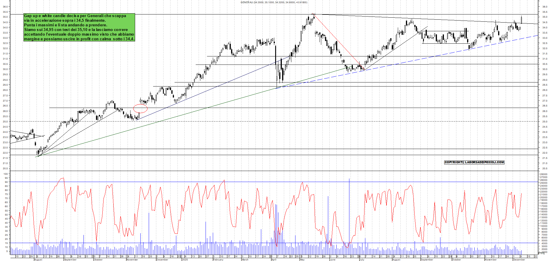 GENERALI: Gap up e white candle decisa per Generali che scappa via in accelerazione sopra i 34,5 finalmente. Punta i massimi e li sta andando a prendere. Siamo sui 34,95 con test dei 35,10 e la lasciamo correre accettando l'eventuale doppio massimo visto che abbiamo margine e possiamo uscire in profit con calma sotto i 34,4.
