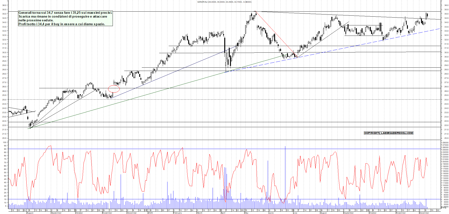 GENERALI: Generali torna sui 34,7 senza fare i 35,25 sui massimi precisi. Scarica ma rimane in condizioni di proseguire e attaccare nelle prossime sedute. Profi tsotto i 34,4 per il buy in essere a cui diamo spazio.
