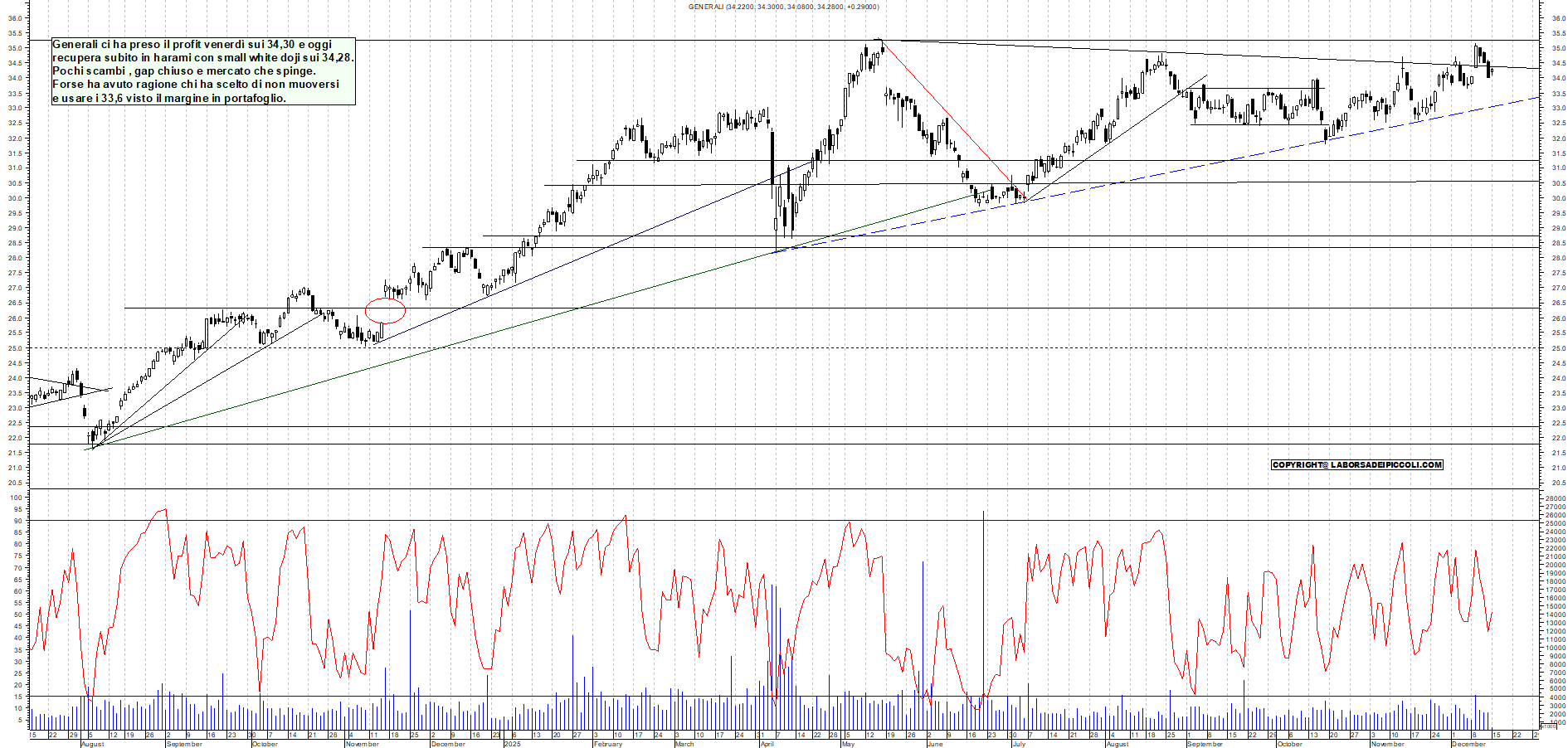 GENERALI: Generali ci ha preso il profit venerdì sui 34,30 e oggi recupera subito in harami con small white doji sui 34,28. Pochi scambi , gap chiuso e mercato che spinge. Forse ha avuto ragione chi ha scelto di non muoversi e usare i 33,6 visto il margine in portafoglio.