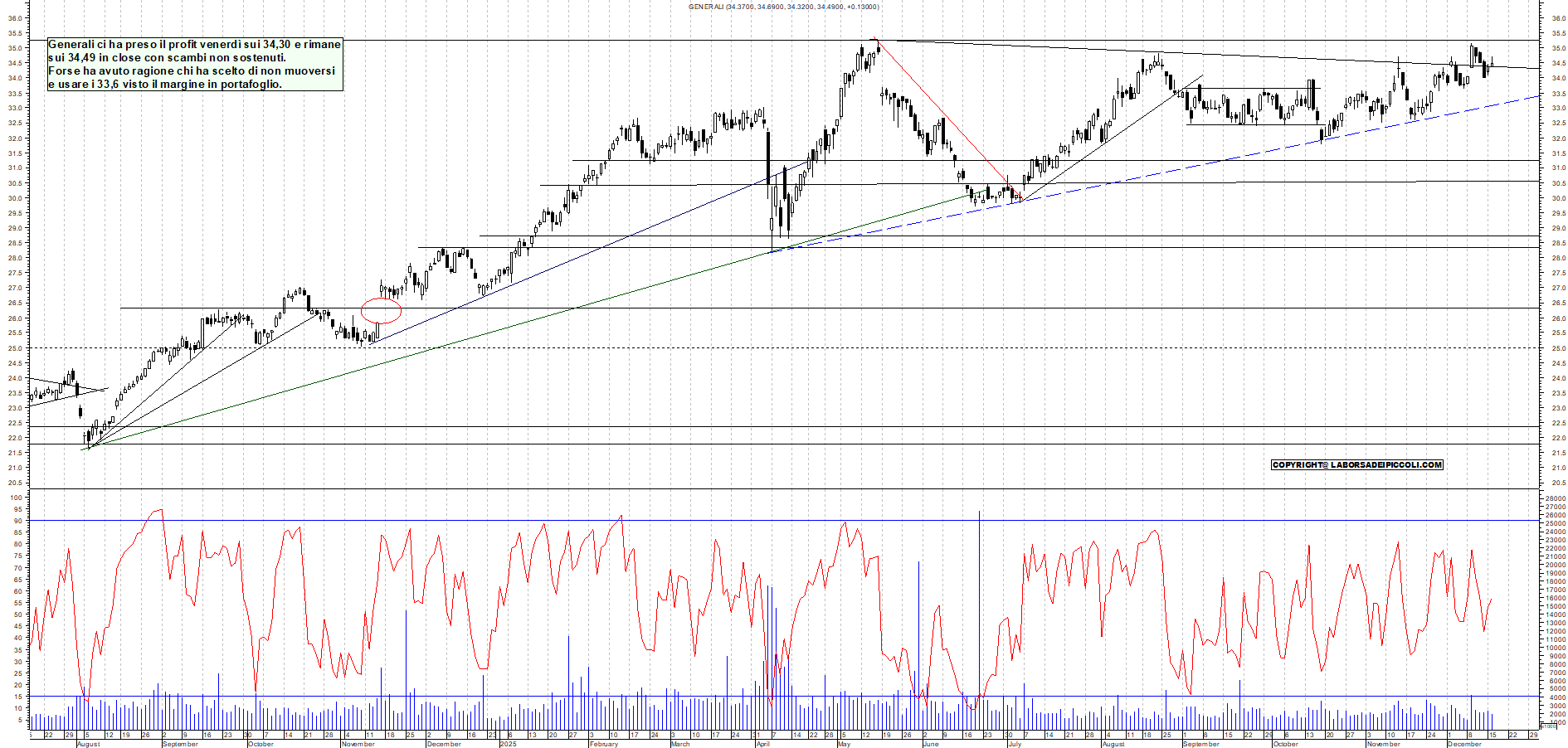 GENERALI: Generali ci ha preso il profit venerdì sui 34,30 e rimane sui 34,49 in close con scambi non sostenuti. Forse ha avuto ragione chi ha scelto di non muoversi e usare i 33,6 visto il margine in portafoglio.