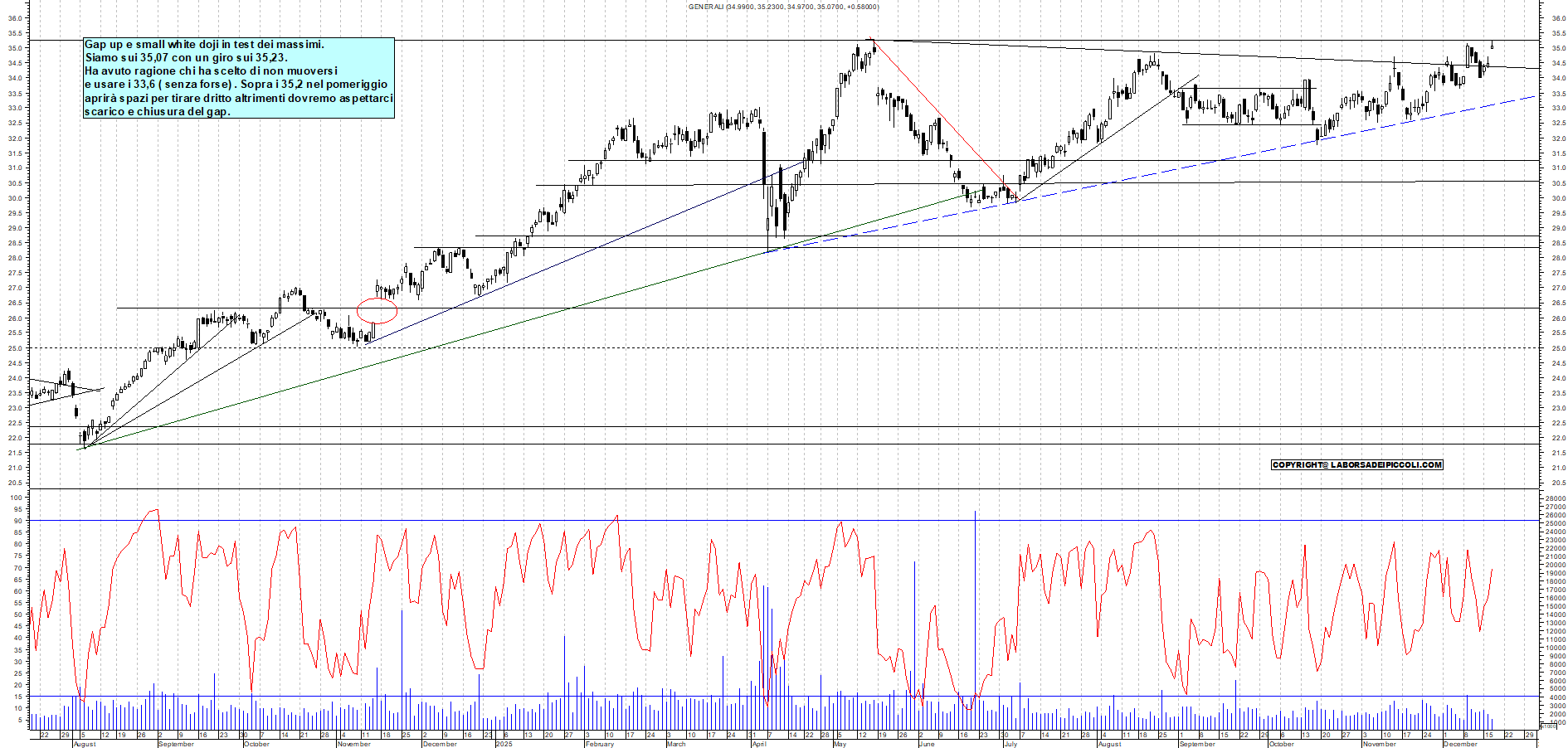 GENERALI: Gap up e small white doji in test dei massimi. Siamo sui 35,07 con un giro sui 35,23. Ha avuto ragione chi ha scelto di non muoversi e usare i 33,6 ( senza forse) . Sopra i 35,2 nel pomeriggio aprirà spazi per tirare dritto altrimenti dovremo aspettarci scarico e chiusura del gap.