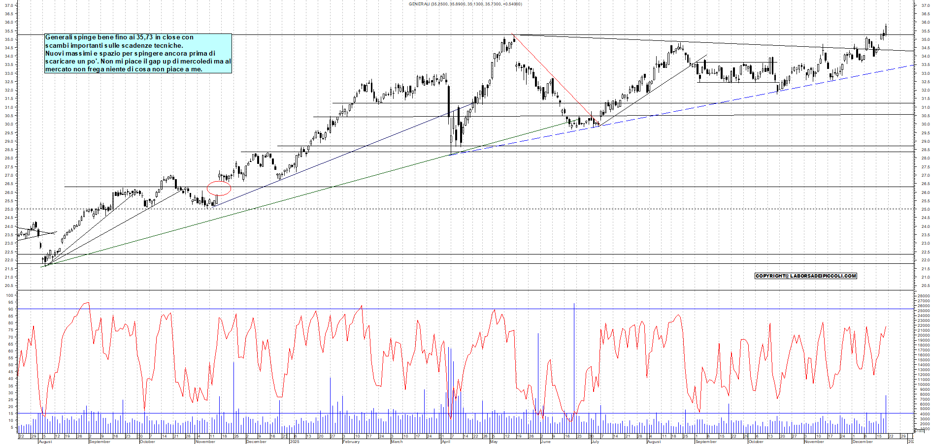 GENERALI: Generali spinge bene fino ai 35,73 in close con scambi importanti sulle scadenze tecniche. Nuovi massimi e spazio per spingere ancora prima di scaricare un po'. Non mi piace il gap up di mercoledì ma al mercato non frega niente di cosa non piace a me.