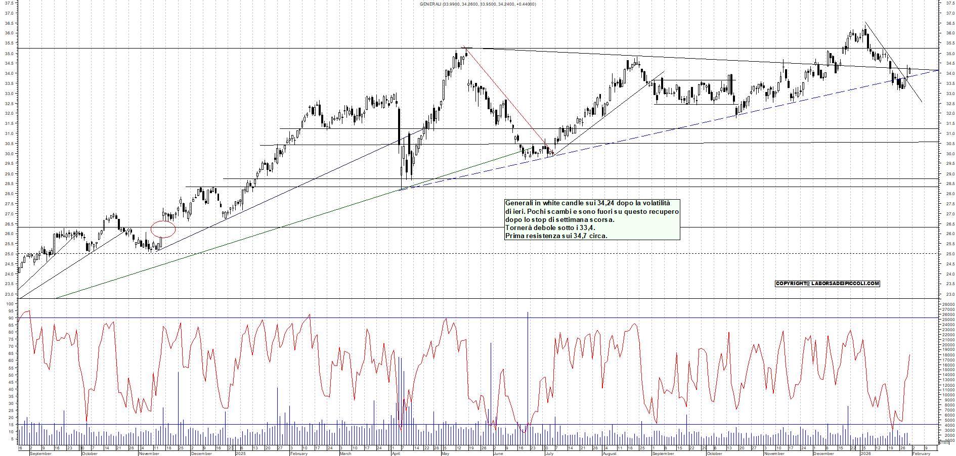 GENERALI: Generali in white candle sui 34,24 dopo la volatilità di ieri. Pochi scambi e sono fuori su questo recupero dopo lo stop di settimana scorsa. Tornerà debole sotto i 33,4. Prima resistenza sui 34,7 circa.