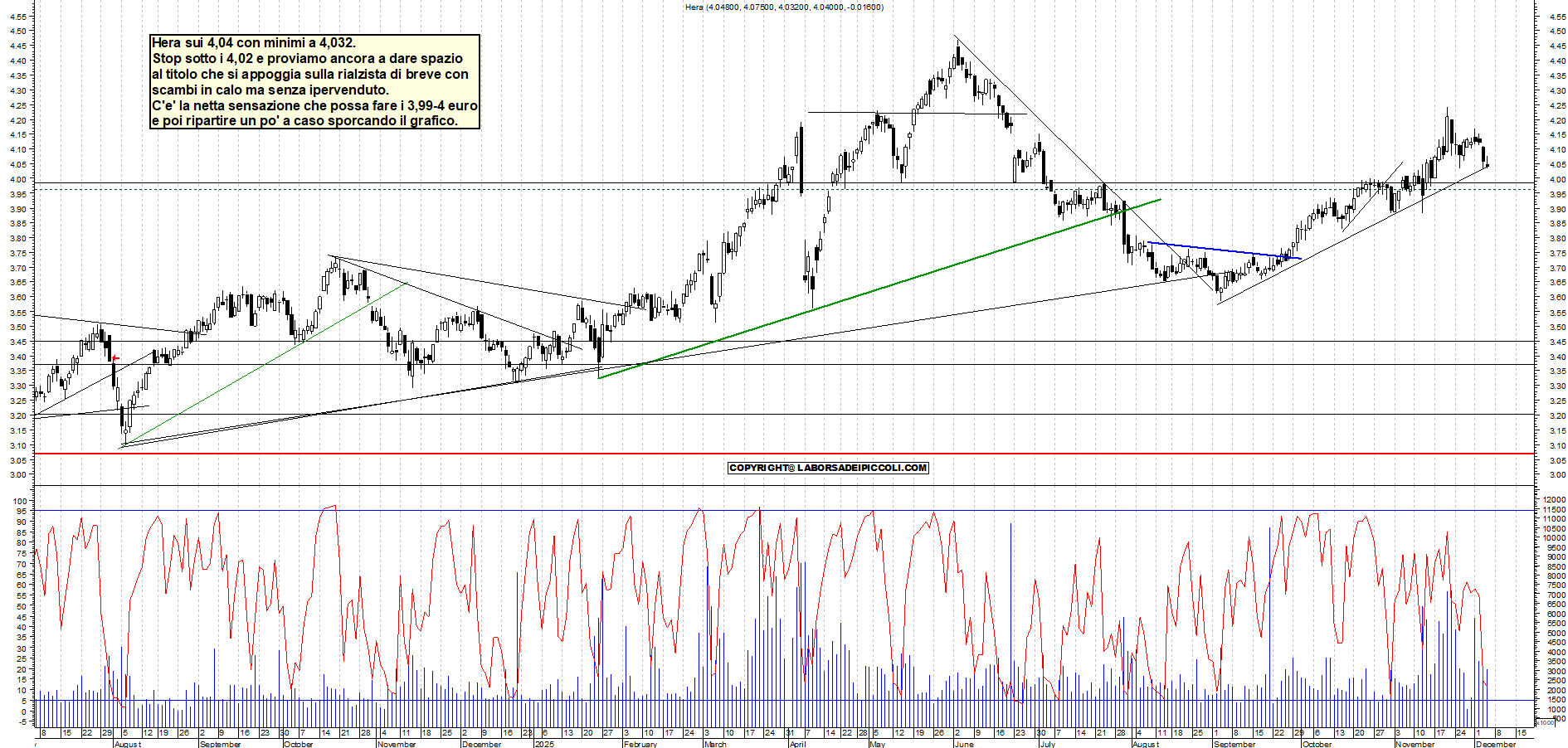 HERA: Hera sui 4,04 con minimi a 4,032. Stop sotto i 4,02 e proviamo ancora a dare spazio al titolo che si appoggia sulla rialzista di breve con scambi in calo ma senza ipervenduto. C'e' la netta sensazione che possa fare i 3,99-4 euro e poi ripartire un po' a caso sporcando il grafico.