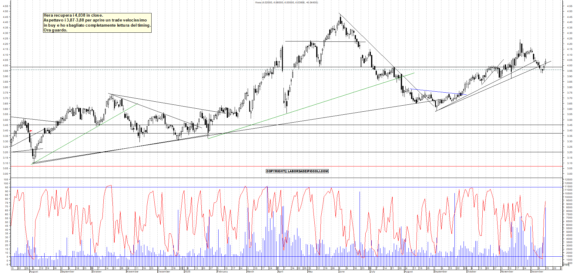 HERA: Hera recupera i 4,038 in close. Aspettavo i 3,87-3,88 per aprire un trade velocissimo in buy e ho sbagliato completamente lettura del timing. Ora guardo.