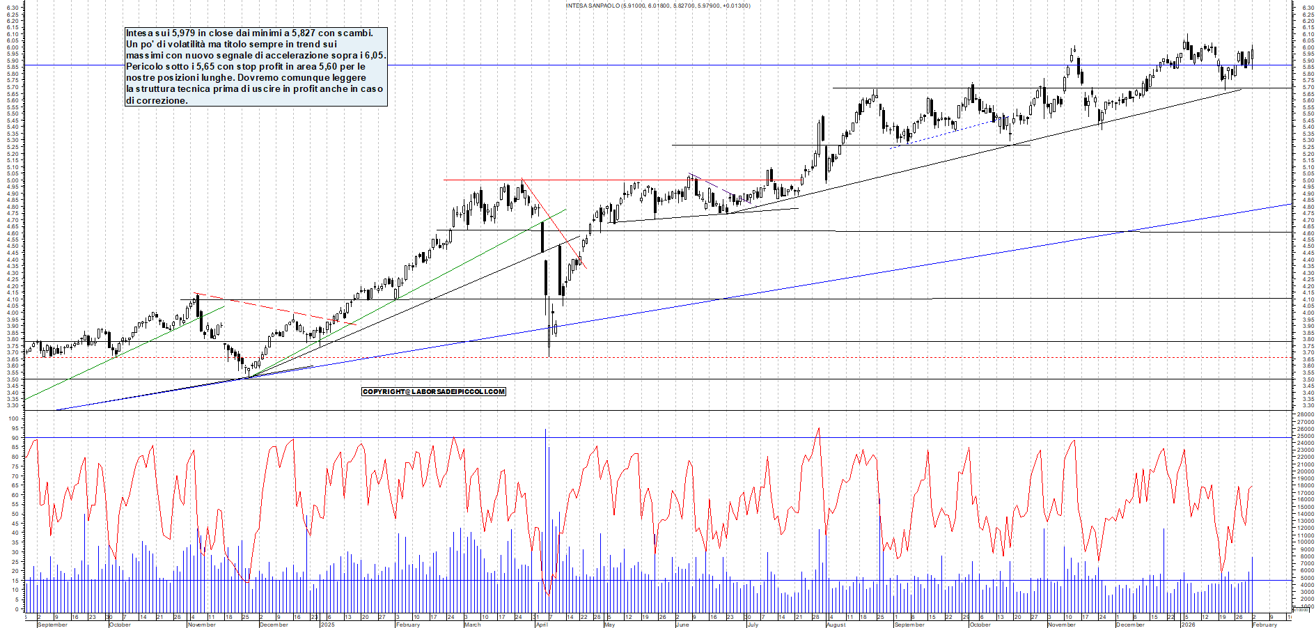 INTESA: Intesa sui 5,979 in close dai minimi a 5,827 con scambi. Un po' di volatilità ma titolo sempre in trend sui massimi con nuovo segnale di accelerazione sopra i 6,05. Pericolo sotto i 5,65 con stop profit in area 5,60 per le nostre posizioni lunghe. Dovremo comunque leggere la struttura tecnica prima di uscire in profit anche in caso di correzione.
