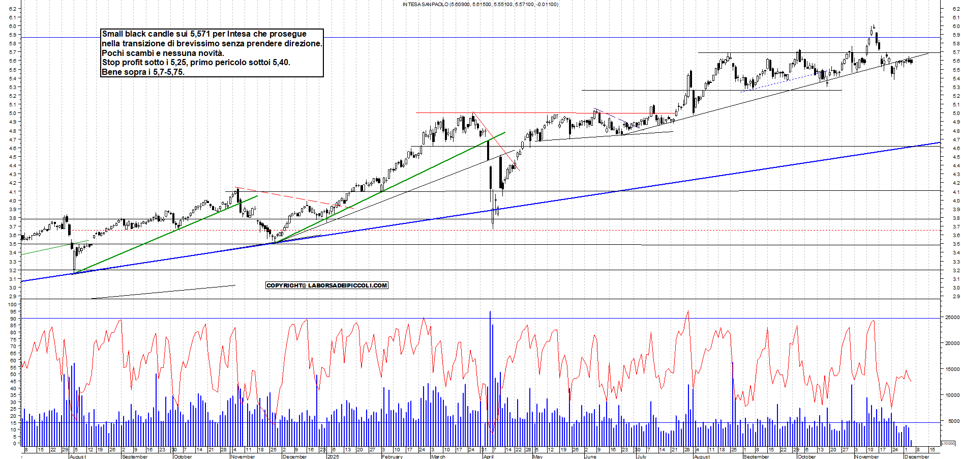 INTESA: Small black candle sui 5,571 per Intesa che prosegue nella transizione di brevissimo senza prendere direzione. Pochi scambi e nessuna novità. Stop profit sotto i 5,25, primo pericolo sottoi 5,40. Bene sopra i 5,7-5,75.