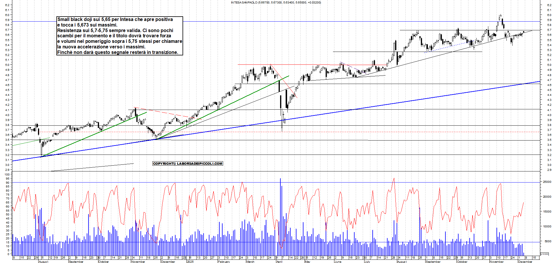 INTESA: Small black doji sui 5,65 per Intesa che apre positiva e tocca i 5,673 sui massimi. Resistenza sui 5,7-5,75 sempre valida. Ci sono pochi scambi per il momento e il titolo dovrà trovare forza e volumi nel pomeriggio sopra i 5,75 stessi per chiamare la nuova accelerazione verso i massimi. Finchè non darà questo segnale resterà in transizione.