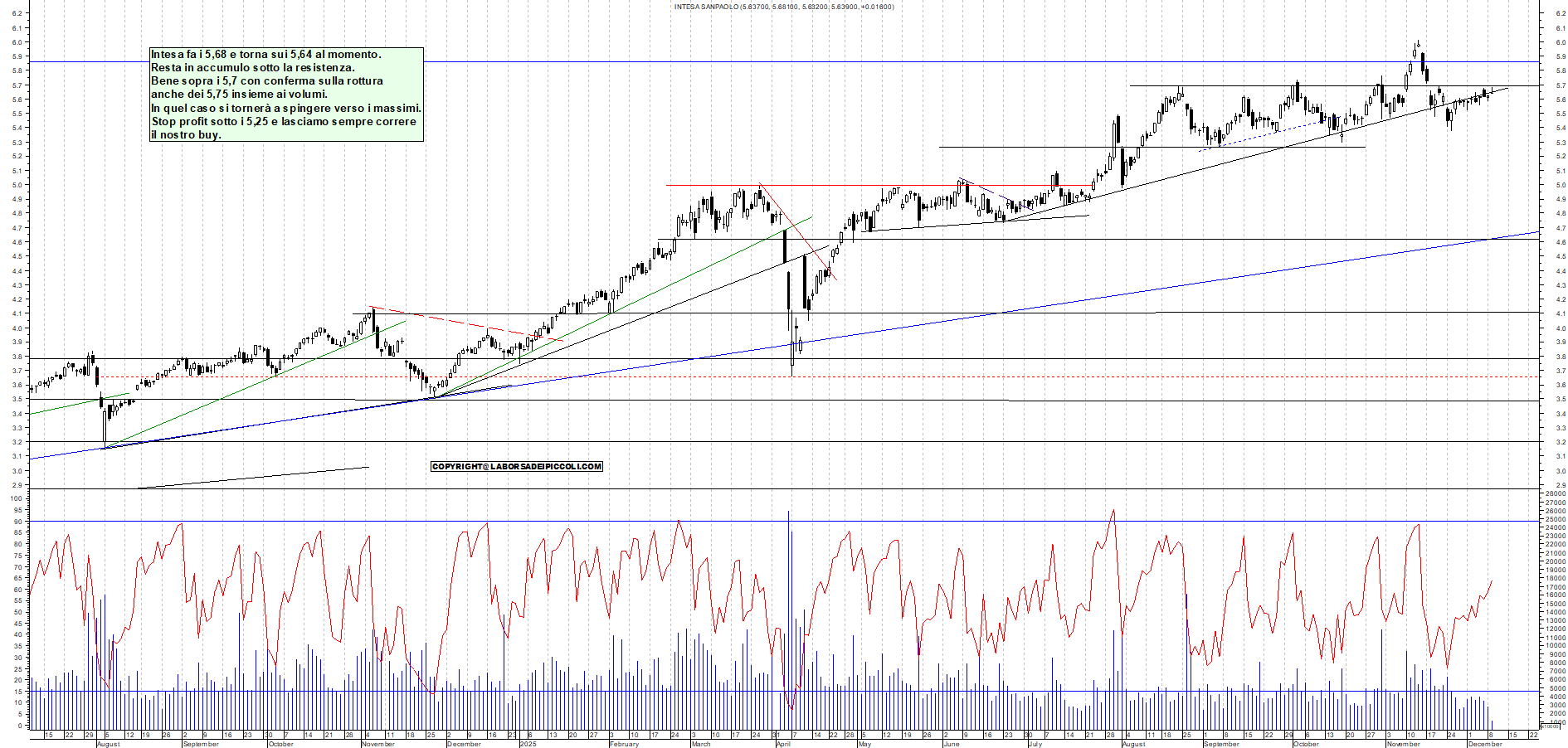 INTESA: Intesa fa i 5,68 e torna sui 5,64 al momento. Resta in accumulo sotto la resistenza. Bene sopra i 5,7 con conferma sulla rottura anche dei 5,75 insieme ai volumi. In quel caso si tornerà a spingere verso i massimi. Stop profit sotto i 5,25 e lasciamo sempre correre il nostro buy.