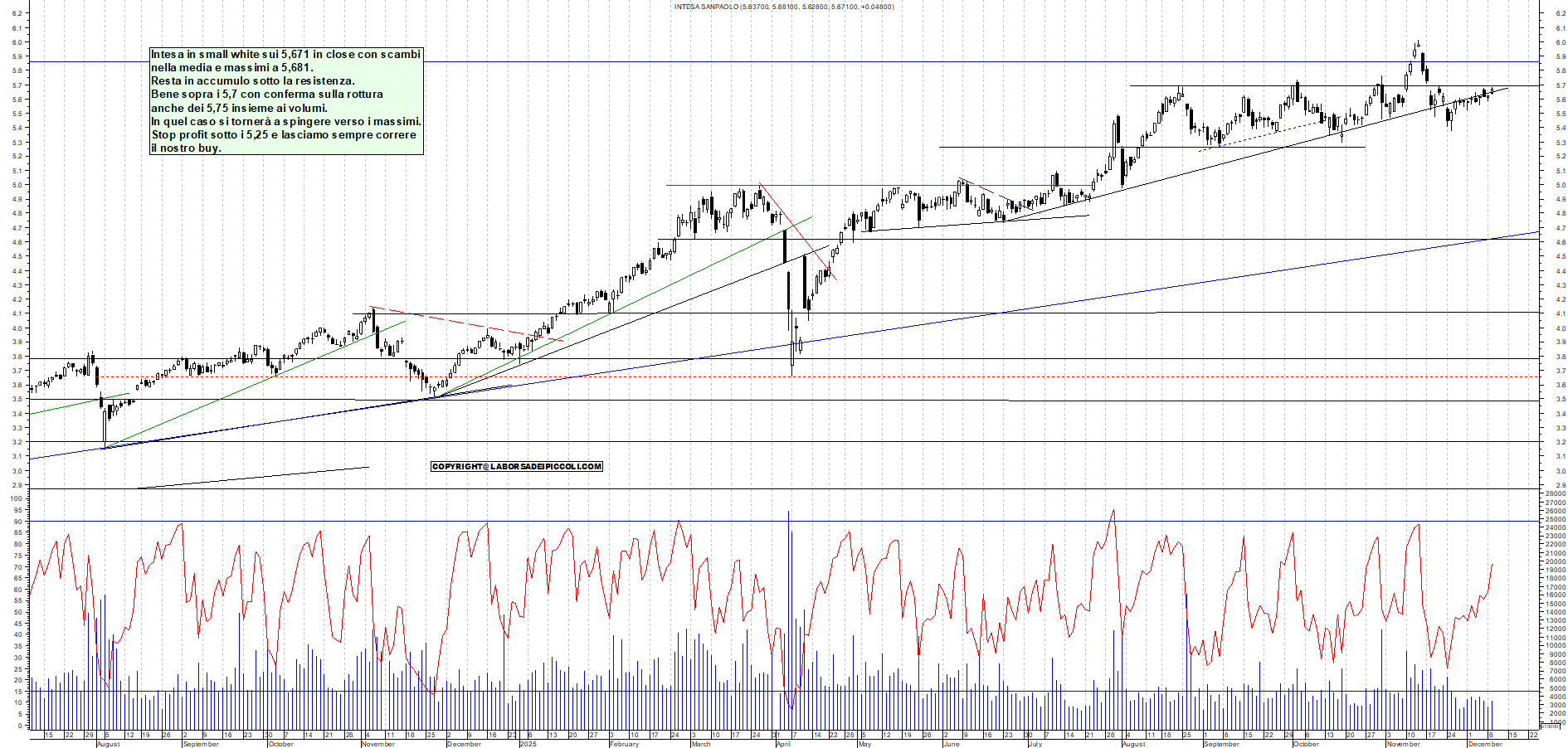 INTESA: Intesa in small white sui 5,671 in close con scambi nella media e massimi a 5,681. Resta in accumulo sotto la resistenza. Bene sopra i 5,7 con conferma sulla rottura anche dei 5,75 insieme ai volumi. In quel caso si tornerà a spingere verso i massimi. Stop profit sotto i 5,25 e lasciamo sempre correre il nostro buy.
