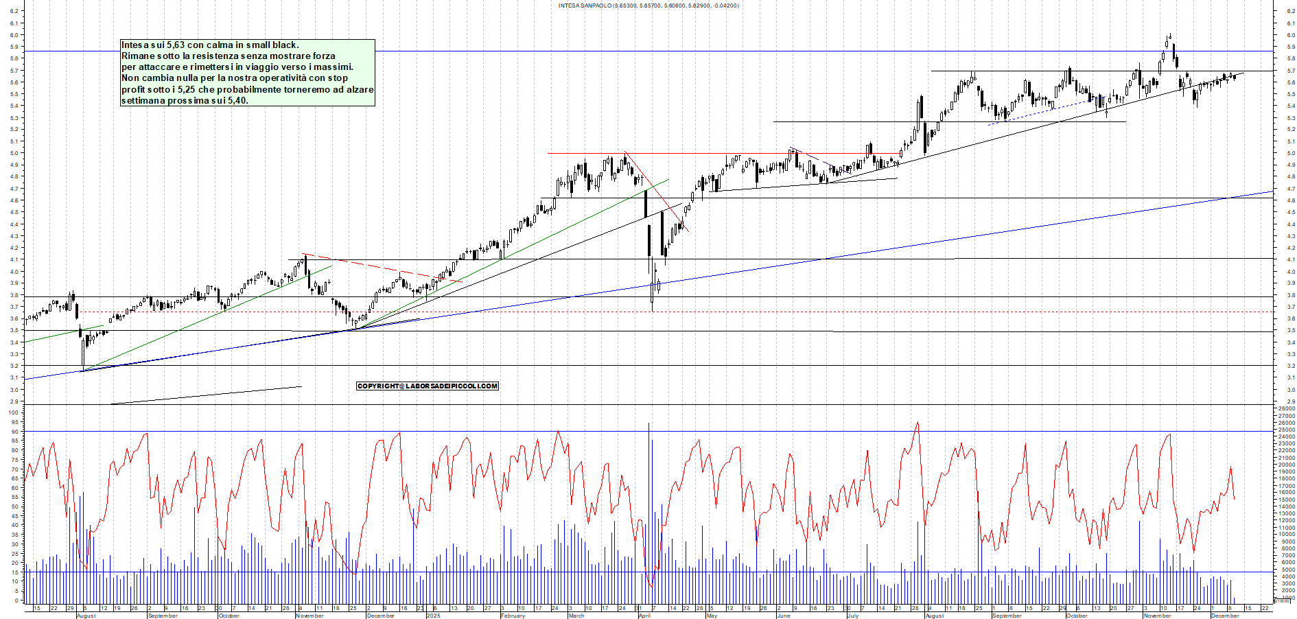 INTESA: Intesa sui 5,63 con calma in small black. Rimane sotto la resistenza senza mostrare forza per attaccare e rimettersi in viaggio verso i massimi. Non cambia nulla per la nostra operatività con stop profit sotto i 5,25 che probabilmente torneremo ad alzare settimana prossima sui 5,40.