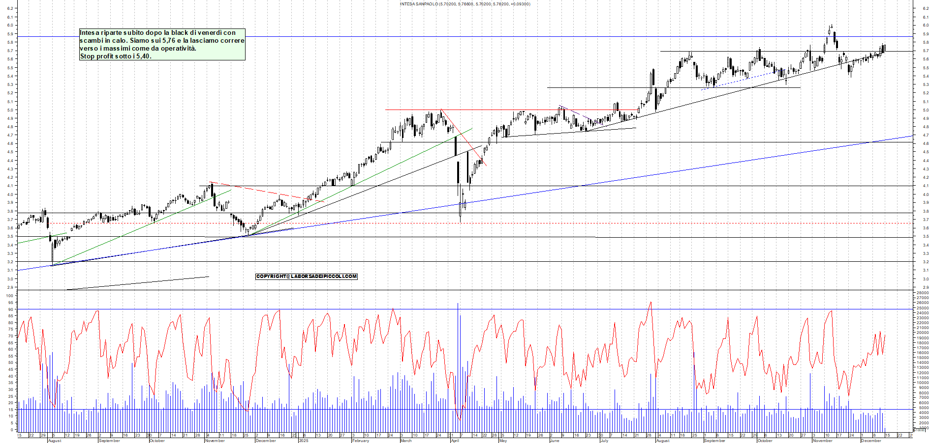 INTESA: Intesa riparte subito dopo la black di venerdì con scambi in calo. Siamo sui 5,76 e la lasciamo correre verso i massimi come da operatività. Stop profit sotto i 5,40.