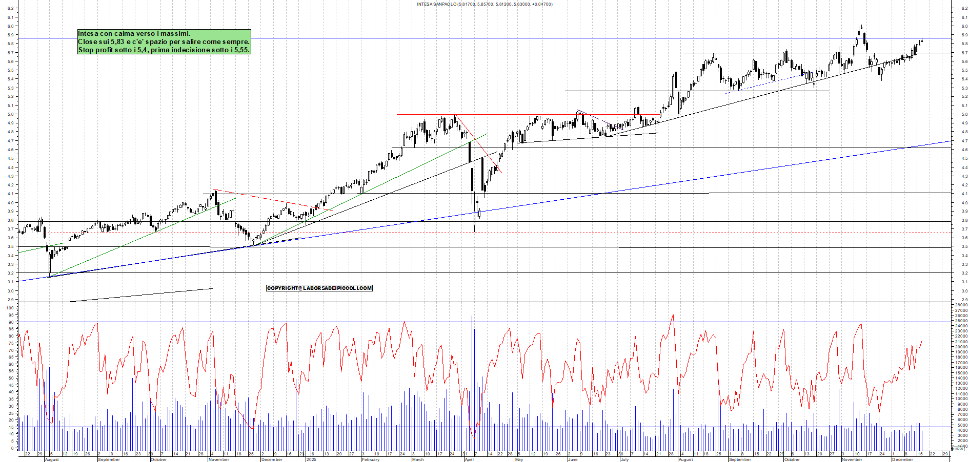 INTESA: Intesa con calma verso i massimi. Close sui 5,83 e c'e' spazio per salire come sempre. Stop profit sotto i 5,4, prima indecisione sotto i 5,55.