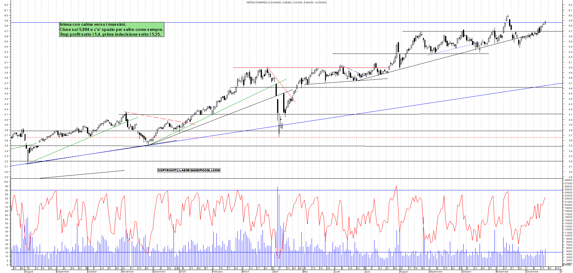 INTESA: Intesa con calma verso i massimi. Close sui 5,884 e c'e' spazio per salire come sempre. Stop profit sotto i 5,4, prima indecisione sotto i 5,55.