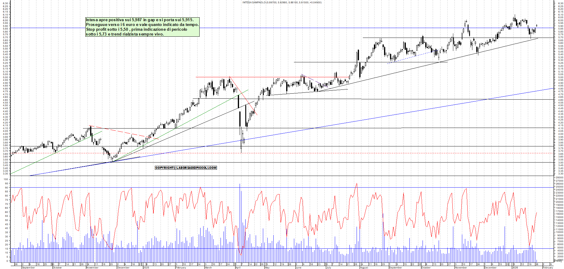 INTESA: Intesa apre positiva sui 5,987 in gap e si porta sui 5,915. Proseguue verso i 6 euro e vale quanto indicato da tempo. Stop profit sotto i 5,50 , prima indicazione di pericolo sotto i 5,73 e trend rialzista sempre vivo.