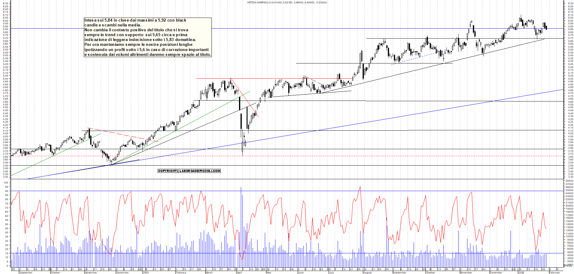 INTESA: Intesa sui 5,84 in close dai massimi a 5,92 con black candle e scambi nella media. Non cambia il contesto positivo del titolo che si trova sempre in trend con supporto sui 5,65 circa e prima indicazione di leggera indecisione sotto i 5,83 domattina. Per ora manteniamo sempre le nostre posizioni lunghe ipotizzando un profit sotto i 5,6 in caso di correzione importanti e sostenuta dai volumi altrimenti daremo sempre spazio al titolo.