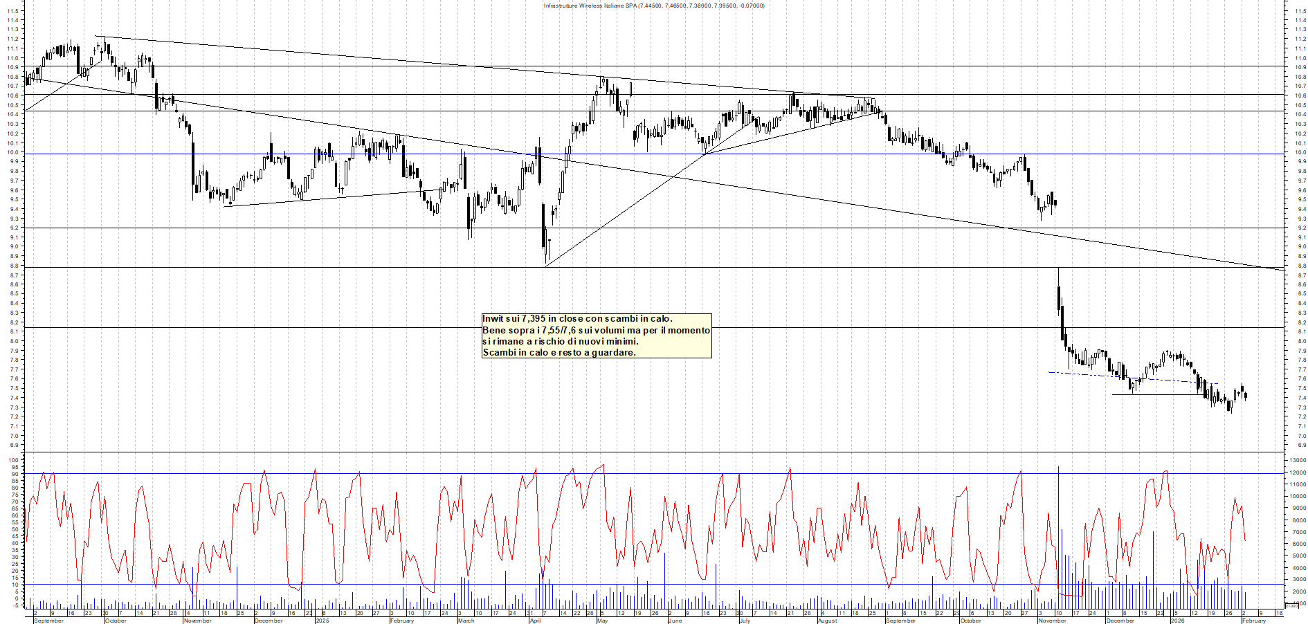 INWIT: Inwit sui 7,395 in close con scambi in calo. Bene sopra i 7,55/7,6 sui volumi ma per il momento si rimane a rischio di nuovi minimi. Scambi in calo e resto a guardare.