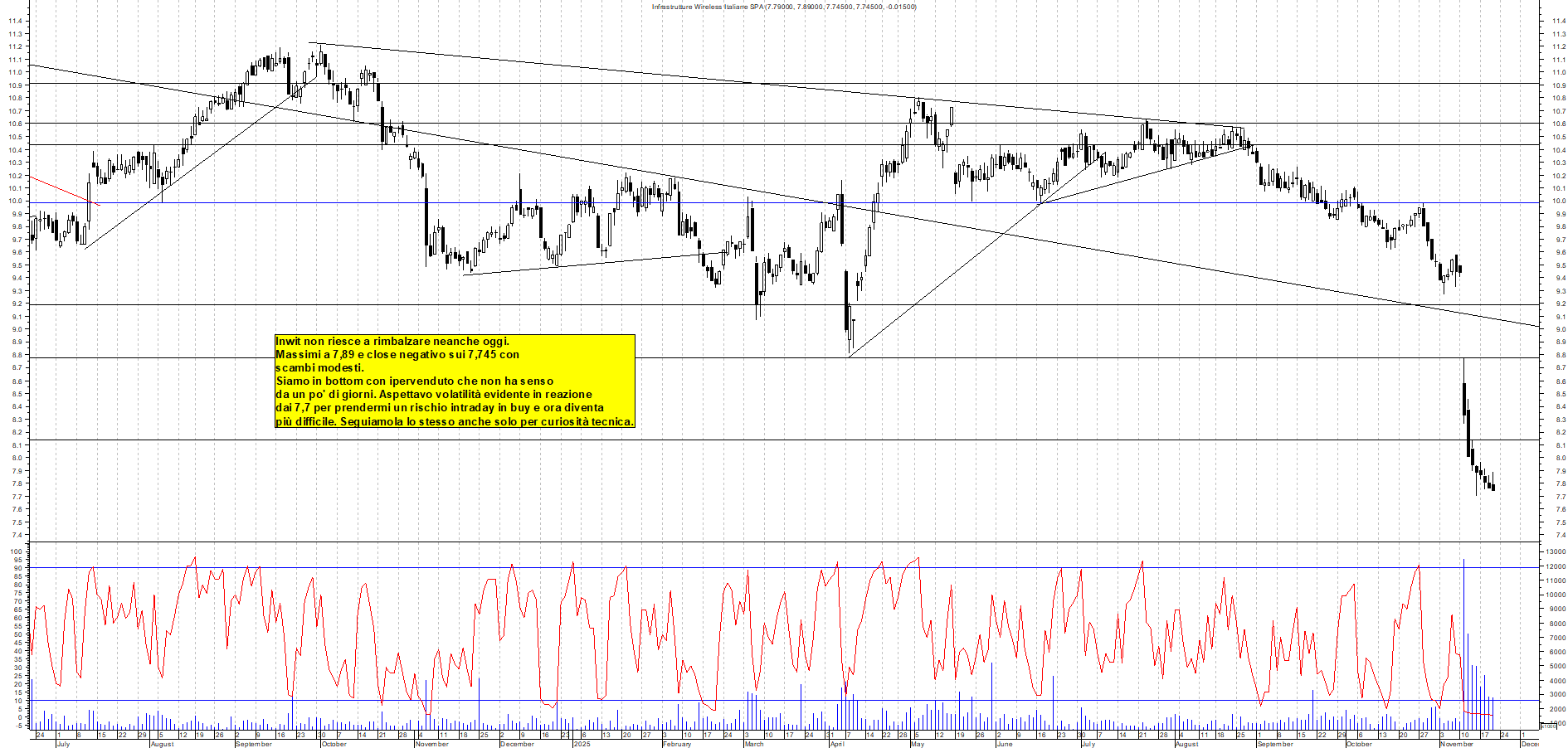INWIT: Inwit non riesce a rimbalzare neanche oggi. Massimi a 7,89 e close negativo sui 7,745 con scambi modesti. Siamo in bottom con ipervenduto che non ha senso da un po' di giorni. Aspettavo volatilità evidente in reazione dai 7,7 per prendermi un rischio intraday in buy e ora diventa più difficile. Seguiamola lo stesso anche solo per curiosità tecnica.