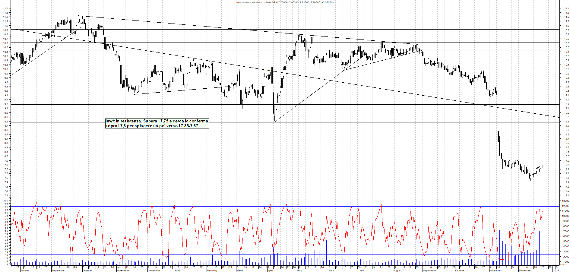 INWIT: Inwit in resistenza. Supera i 7,75 e cerca la conferma sopra i 7,8 per spingere un po' verso i 7,85-7,87.