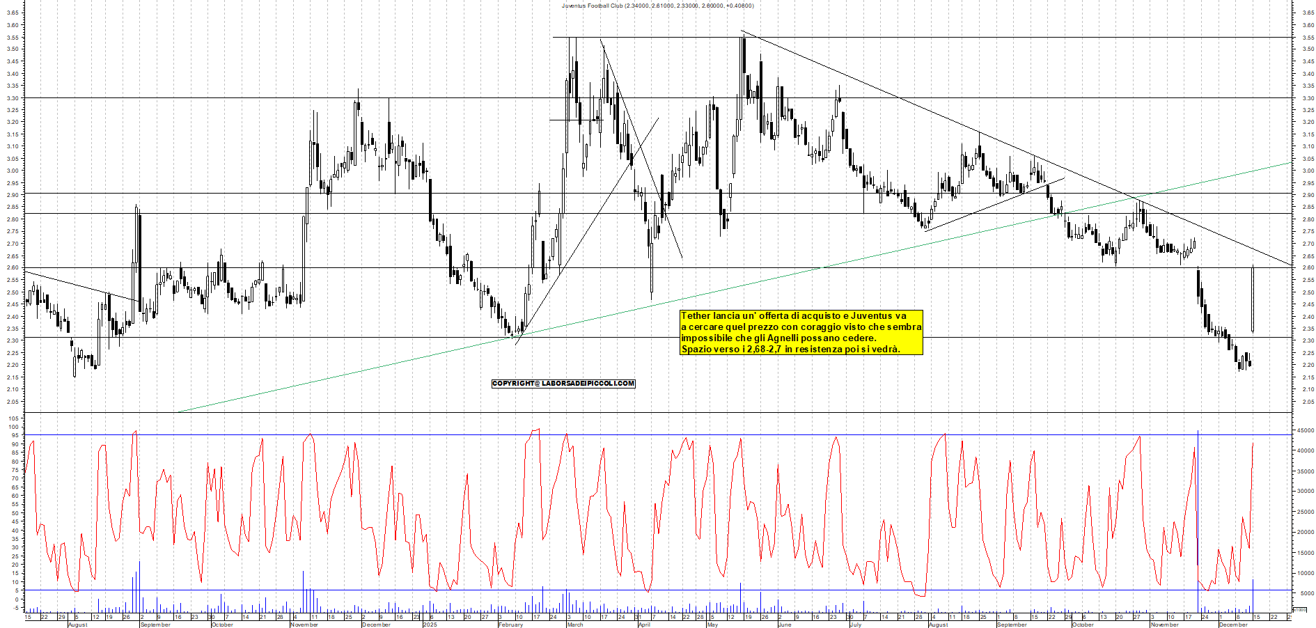 JUVENTUS: Tether lancia un' offerta di acquisto e Juventus va a cercare quel prezzo con coraggio visto che sembra impossibile che gli Agnelli possano cedere. Spazio verso i 2,68-2,7 in resistenza poi si vedrà.