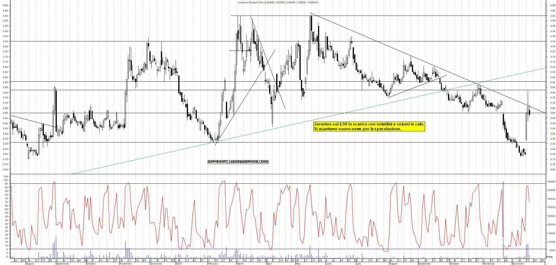JUVENTUS: Juventus sui 2,58 in scarico con volatilità e volumi in calo. Si aspettano nuove news per la speculazione.