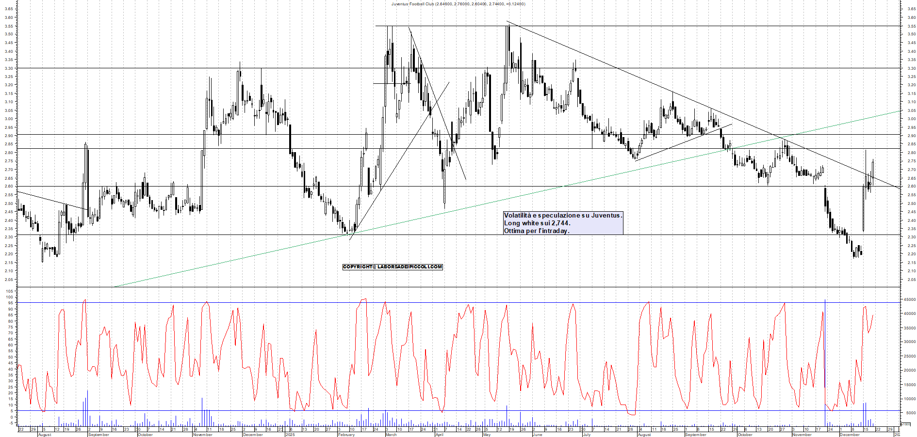JUVENTUS: Volatilità e speculazione su Juventus. Long white sui 2,744. Ottima per l'intraday.