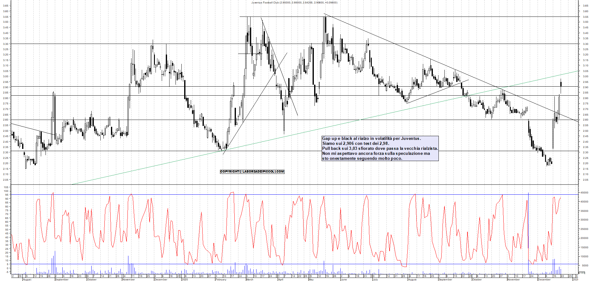 JUVENTUS: Gap up e black al rialzo in volatilità per Juventus. Siamo sui 2,906 con test dei 2,98. Pull back sui 3,03 sfiorato dove passa la vecchia rialzista. Non mi aspettavo ancora forza sulla speculazione ma sto onestamente seguendo molto poco.