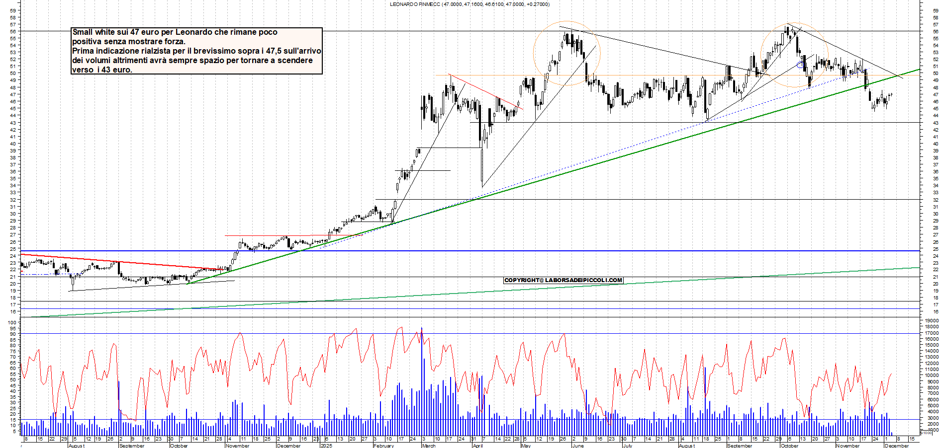 LEONARDO: Small white sui 47 euro per Leonardo che rimane poco positiva senza mostrare forza. Prima indicazione rialzista per il brevissimo sopra i 47,5 sull'arrivo dei volumi altrimenti avrà sempre spazio per tornare a scendere verso i 43 euro.