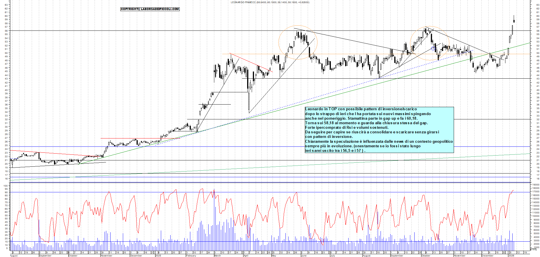 LEONARDO: Leonardo in TOP con possibile pattern di inversione/scarico dopo lo strappo di ieri che l ha portata sui nuovi massimi spingendo anche nel pomeriggio. Stamattina parte in gap up e fa i 60,18. Torna sui 58,18 al momento e guarda alla chiusura stessa del gap. Forte ipercomprato di Rsi e volumi sostenuti. Da seguire per capire se riuscirà a consolidare e scaricare senza girarsi con pattern di inversione. Chiaramente la speculazione è influenzata dalle news di un contesto geopolitico sempre più in evoluzione. (onestamente se io fossi stato lungo ieri sarei uscito tra i 56,5 e i 57 ) .