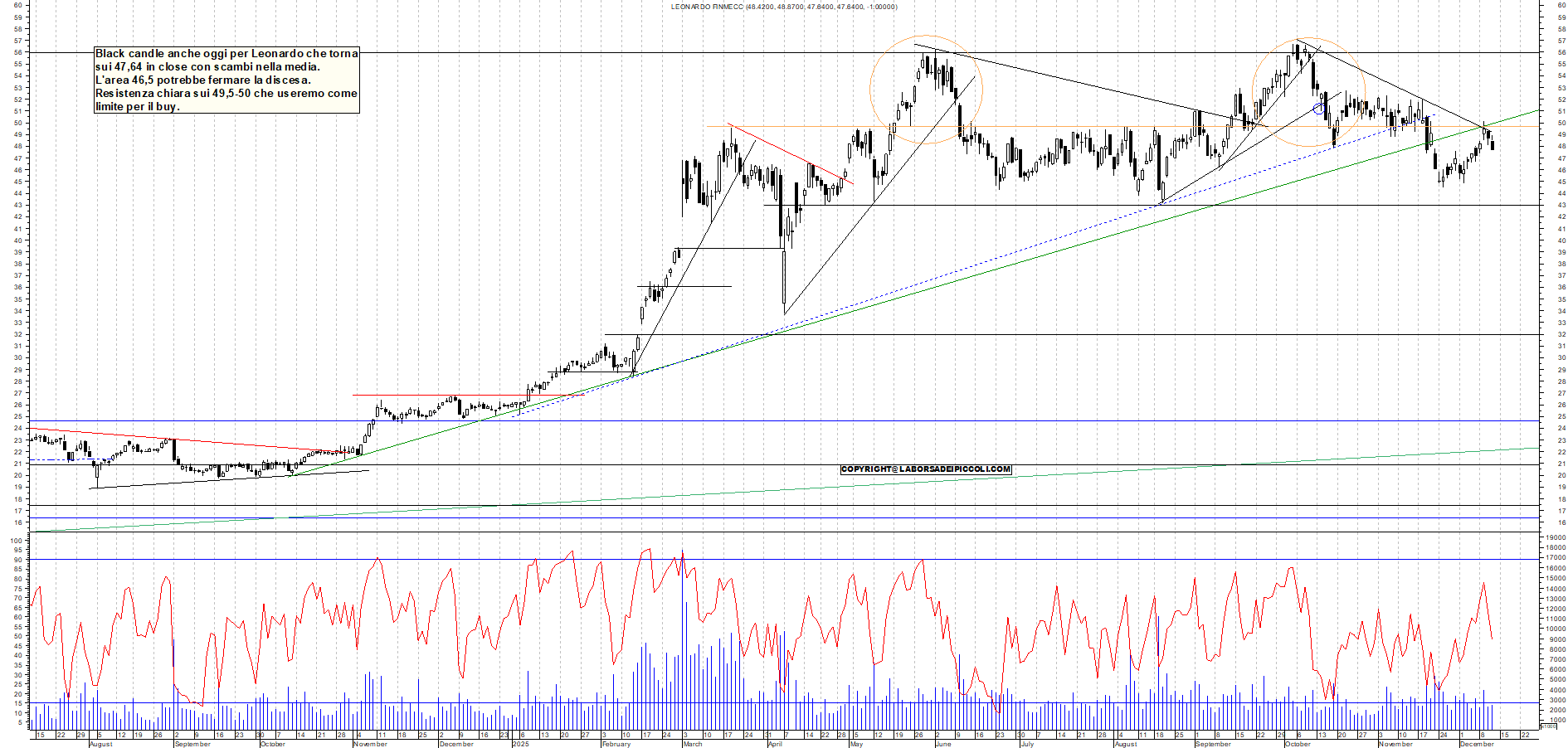 LEONARDO: Black candle anche oggi per Leonardo che torna sui 47,64 in close con scambi nella media. L'area 46,5 potrebbe fermare la discesa. Resistenza chiara sui 49,5-50 che useremo come limite per il buy.