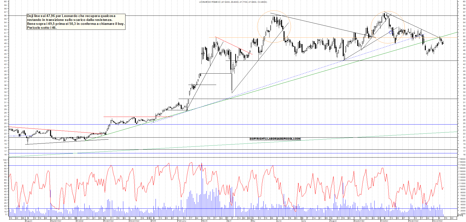 LEONARDO: Doji line sui 47,96 per Leonardo che recupera qualcosa restando in transizione sullo scarico dalla resistenza. Bene sopra i 49,5 prima ei 50,3 in conferma a chiamare il buy. Pericolo sotto i 46.