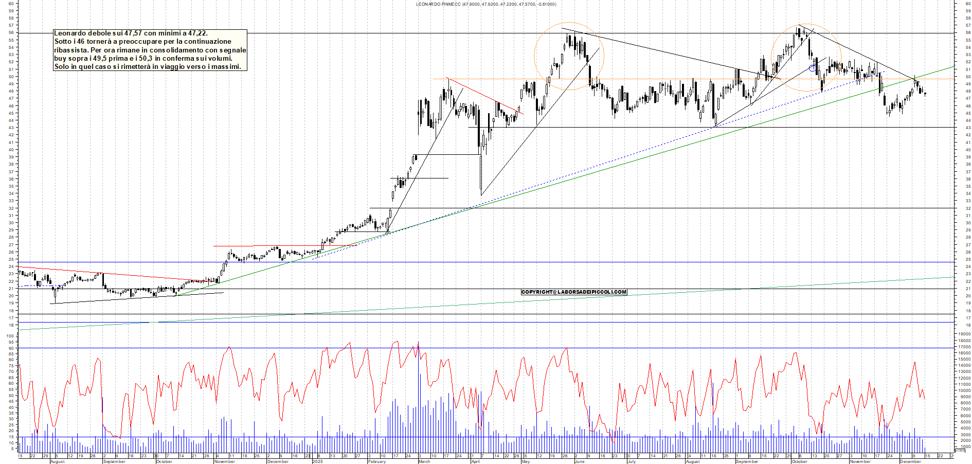 LEONARDO: Leonardo debole sui 47,57 con minimi a 47,22. Sotto i 46 tornerà a preoccupare per la continuazione ribassista. Per ora rimane in consolidamento con segnale buy sopra i 49,5 prima e i 50,3 in conferma sui volumi. Solo in quel caso si rimetterà in viaggio verso i massimi.