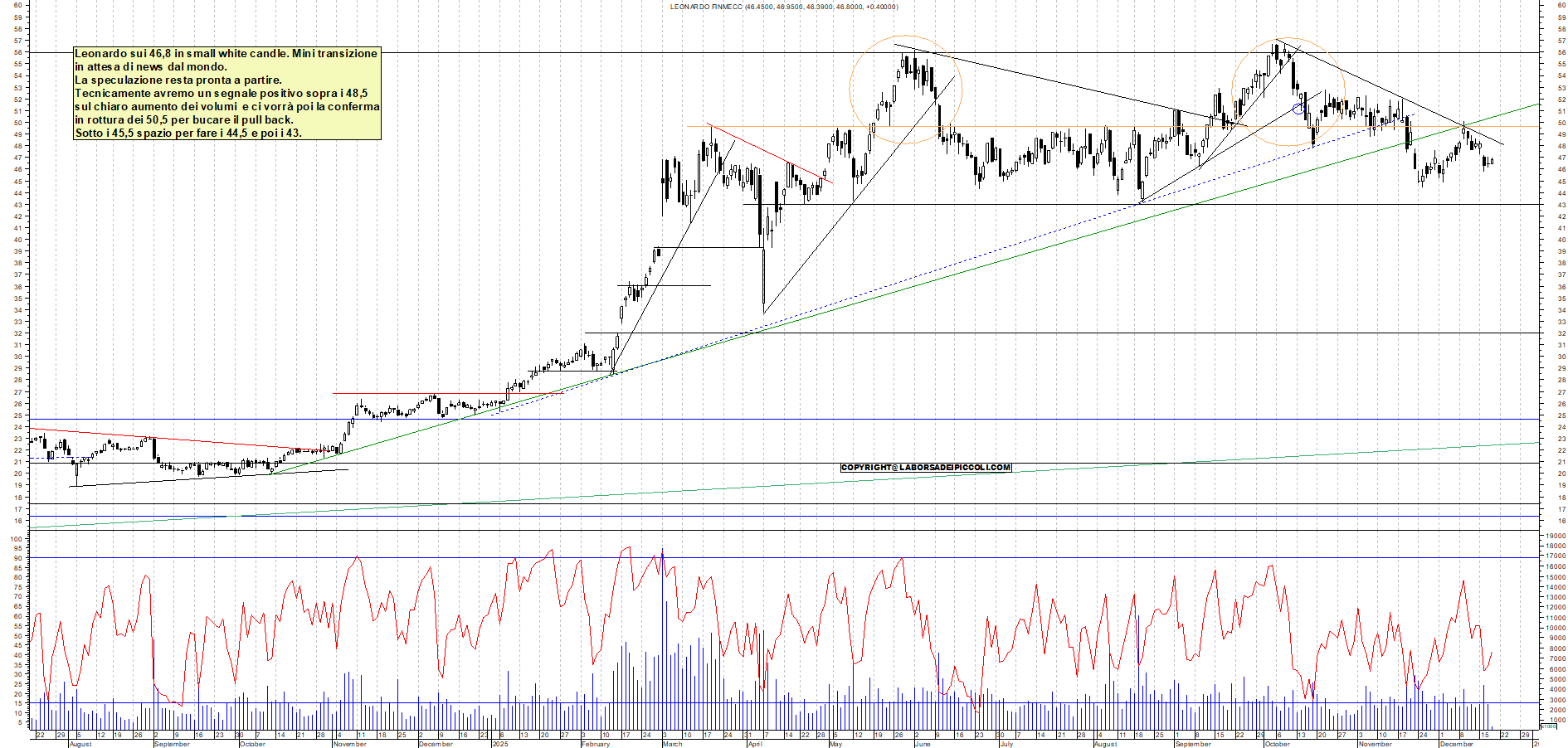 LEONARDO: Leonardo sui 46,8 in small white candle. Mini transizione in attesa di news dal mondo. La speculazione resta pronta a partire. Tecnicamente avremo un segnale positivo sopra i 48,5 sul chiaro aumento dei volumi e ci vorrà poi la conferma in rottura dei 50,5 per bucare il pull back. Sotto i 45,5 spazio per fare i 44,5 e poi i 43.