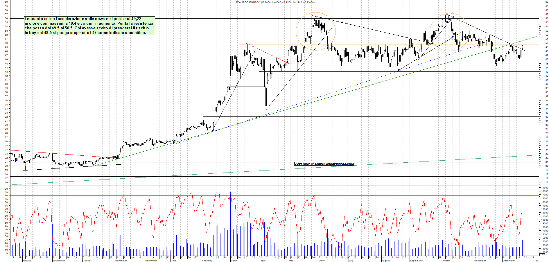 LEONARDO: Leonardo cerca l'accelerazione sulle news e si porta sui 49,22 in close con massimi a 49,4 e volumi in aumento. Punta la resistenza. che passa dai 49,5 ai 50,5. Chi avesse scelto di prendersi il rischio in buy sui 48,5 si ponga stop sotto i 47 come indicato stamattina.