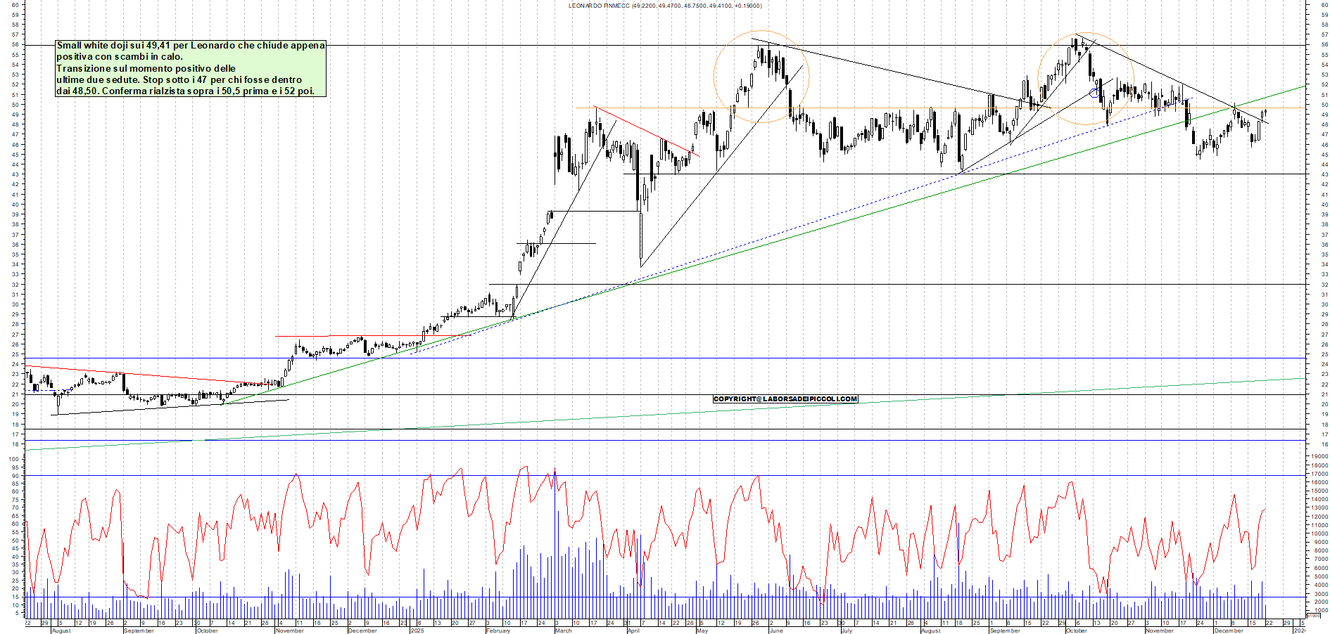 LEONARDO: Small white doji sui 49,41 per Leonardo che chiude appena positiva con scambi in calo. Transizione sul momento positivo delle ultime due sedute. Stop sotto i 47 per chi fosse dentro dai 48,50. Conferma rialzista sopra i 50,5 prima e i 52 poi.