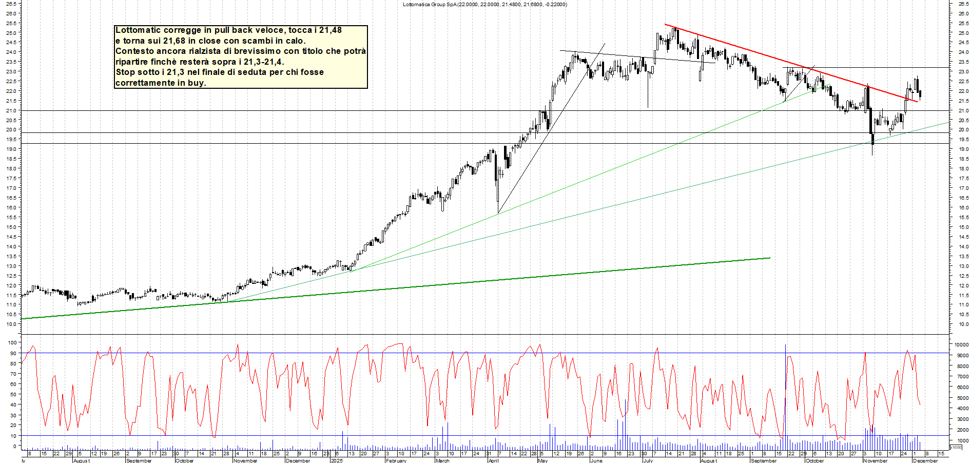 LOTTOMATICA: Lottomatic corregge in pull back veloce, tocca i 21,48 e torna sui 21,68 in close con scambi in calo. Contesto ancora rialzista di brevissimo con titolo che potrà ripartire finchè resterà sopra i 21,3-21,4. Stop sotto i 21,3 nel finale di seduta per chi fosse correttamente in buy.