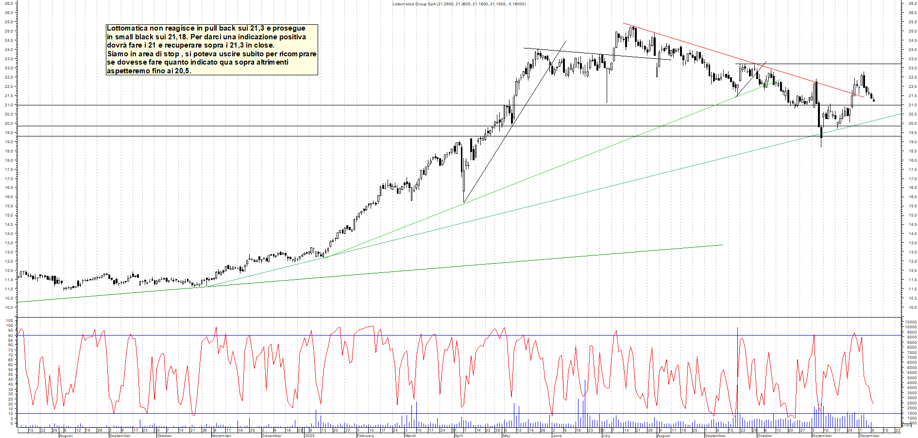LOTTOMATICA: Lottomatica non reagisce in pull back sui 21,3 e prosegue in small black sui 21,18. Per darci una indicazione positiva dovrà fare i 21 e recuperare sopra i 21,3 in close. Siamo in area di stop , si poteva uscire subito per ricomprare se dovesse fare quanto indicato qua sopra altrimenti aspetteremo fino ai 20,5.